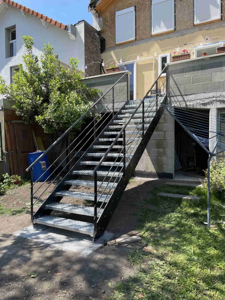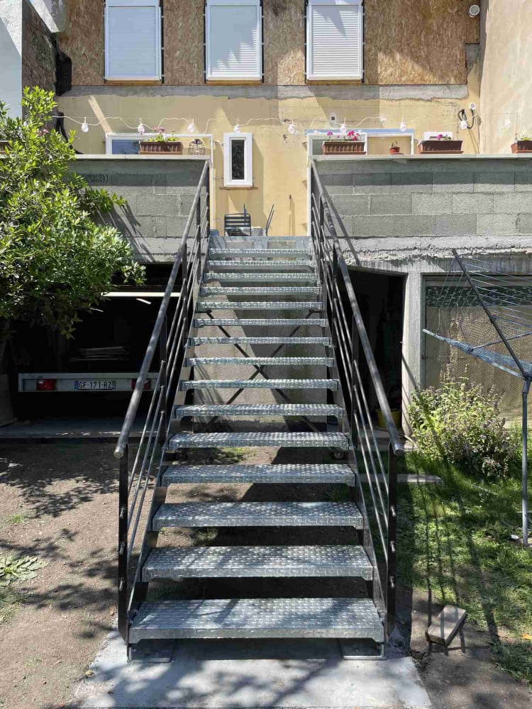 Fabrication et pose d'un escalier droit extérieur, marches en acier larmé galvanisé dans le secteur de Clermont-Ferrand.