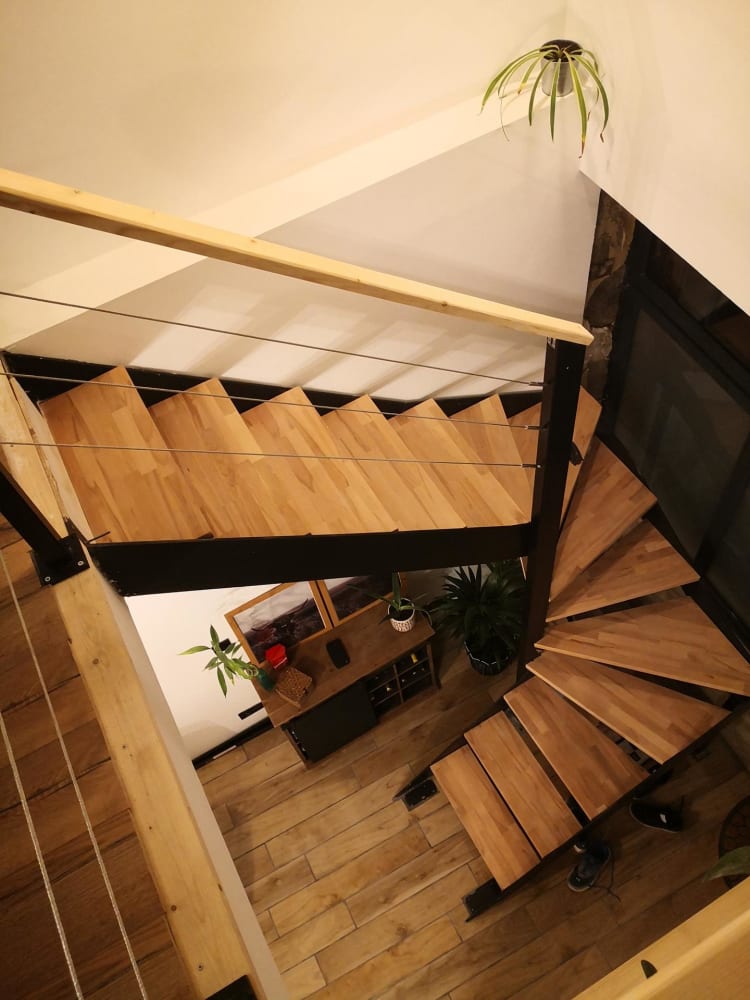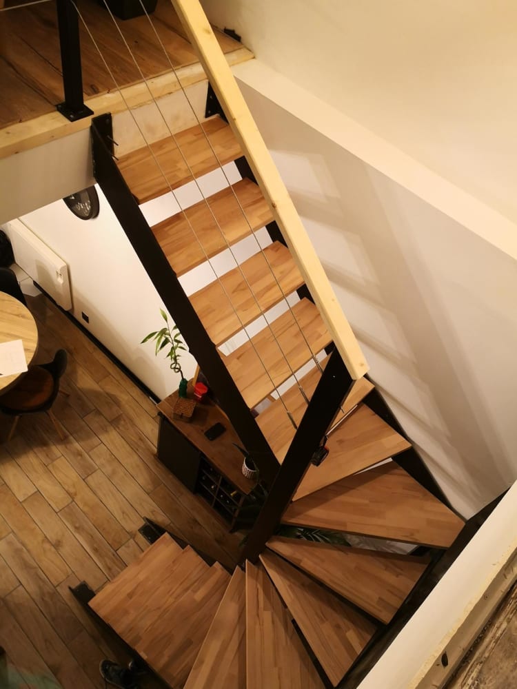 Pose en rénovation d'un garde corps sur un escalier et pièce de vie, double quart tournant