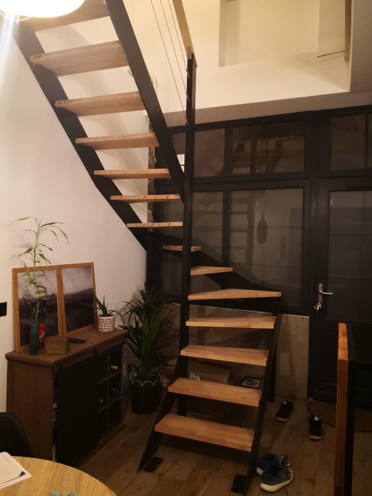 Escalier palier haut, quart tournant, bois frêne et acier thermolaqué noir